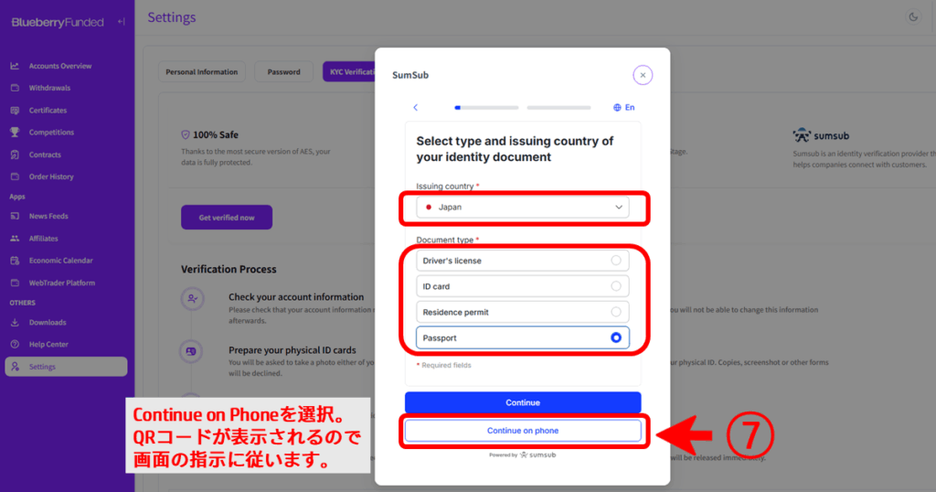 認証に使う身分証明書の種類を選択し「Continue on Phone」をクリック(⑦)