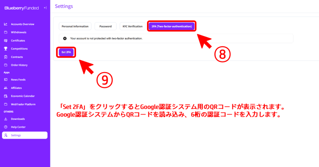設定画面の2段階認証タブから「Set 2FA」をクリック(⑧~⑨)
