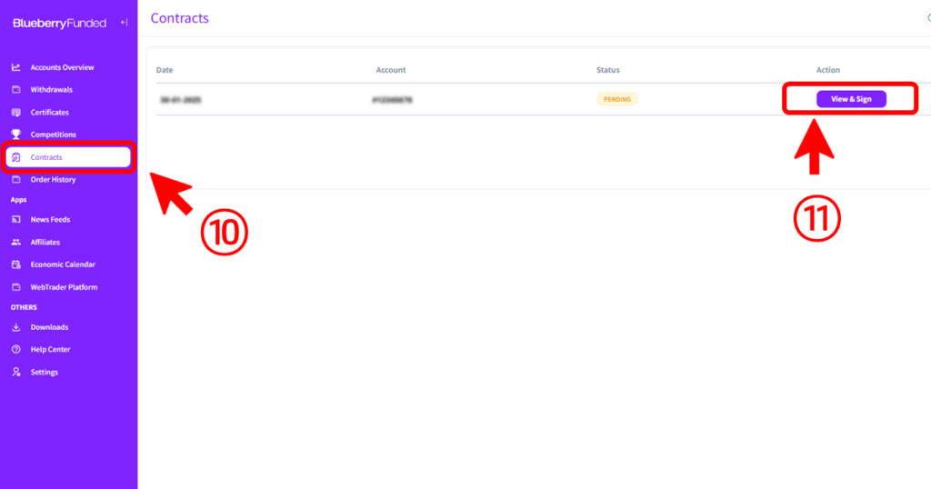「契約書」から「View & Sign」を選択(⑩~⑪)