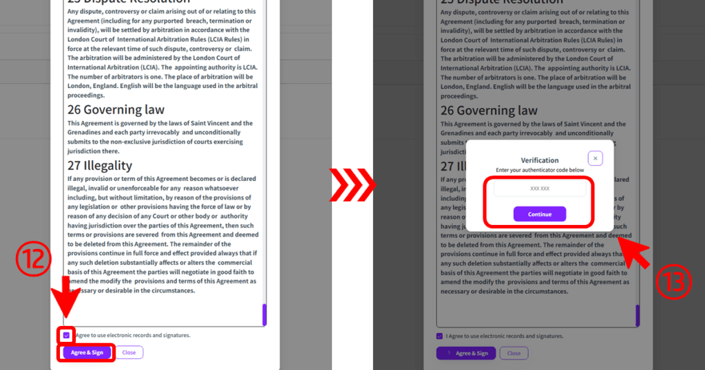 契約書のサインは、KYC認証と2段階認証が済んでいないとサインできないので、手順どおりに進めてくださいね。
