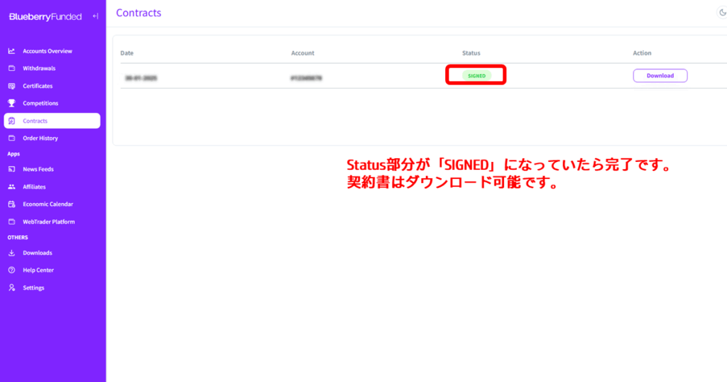 Blueberry Fundedでは、KYC認証と2段階認証の後に、契約書にサインができるようになります。