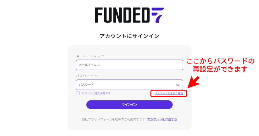 アカウント作成時に届く「Funded7 – Funded7へようこそ。」という件名のメールからダッシュボードにログインができます。