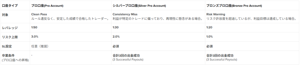 違反の深刻度や頻度に基づき、運営チームの判断で2ランクダウンの「ブロンズプロ口座」が適用される場合もあります。